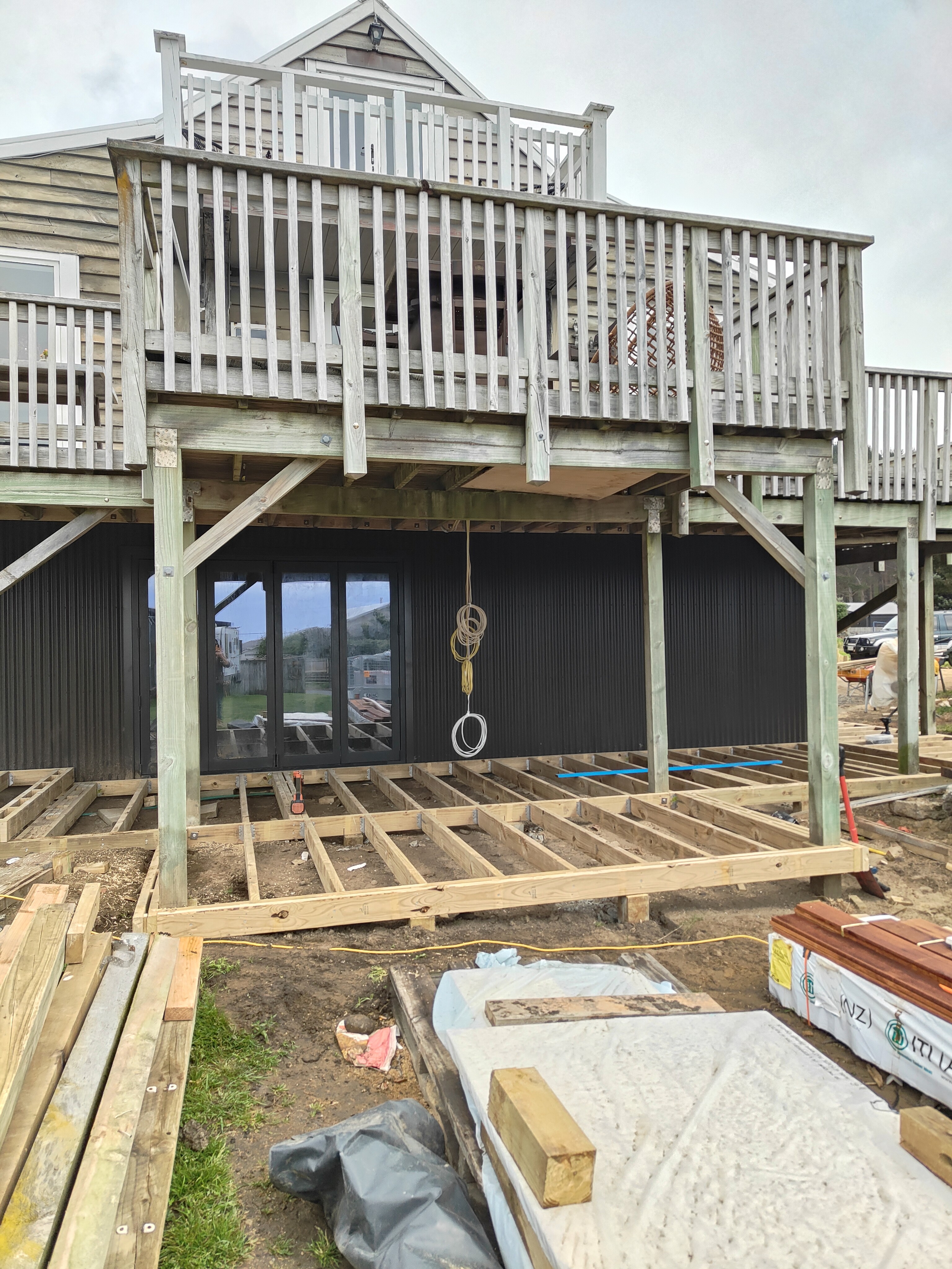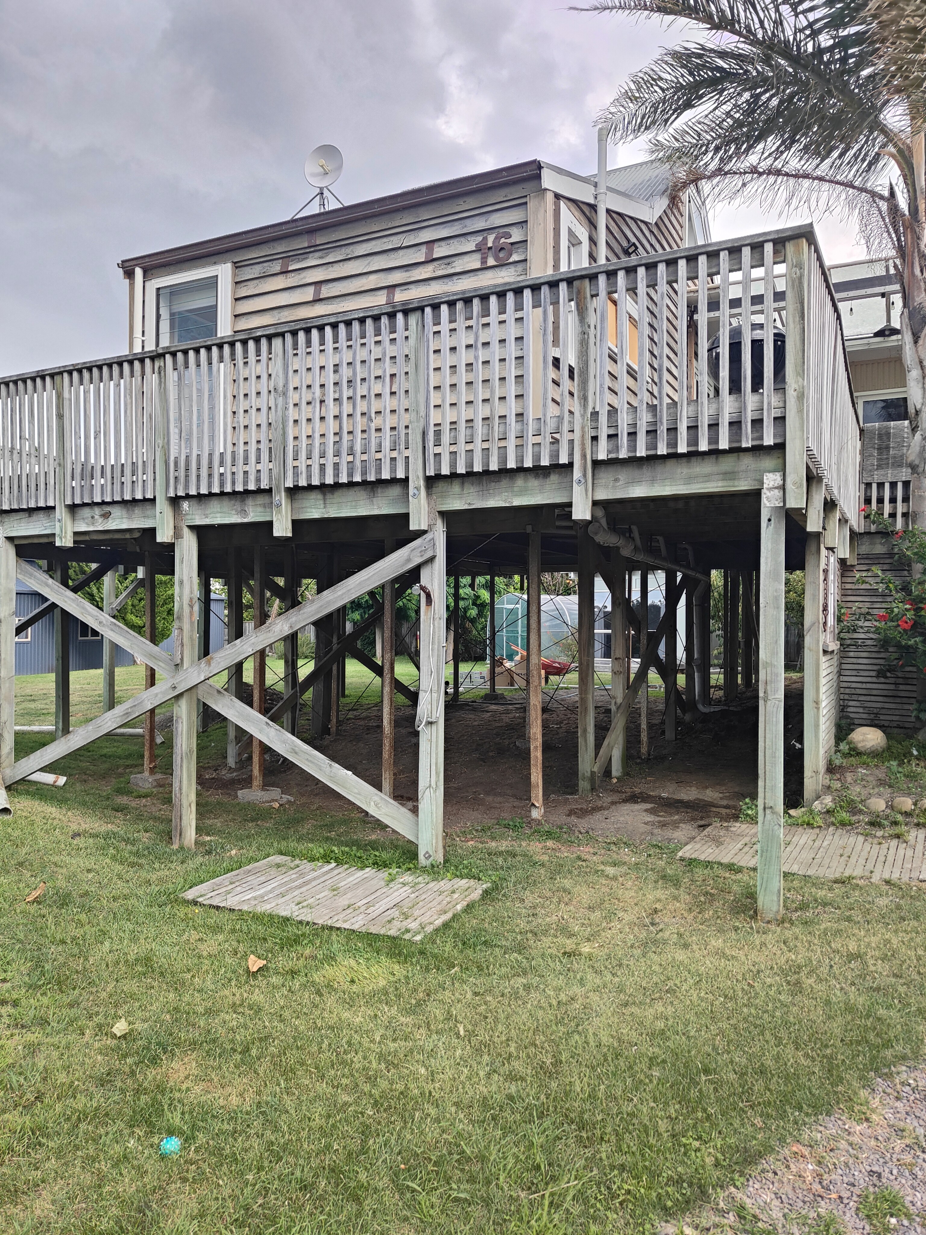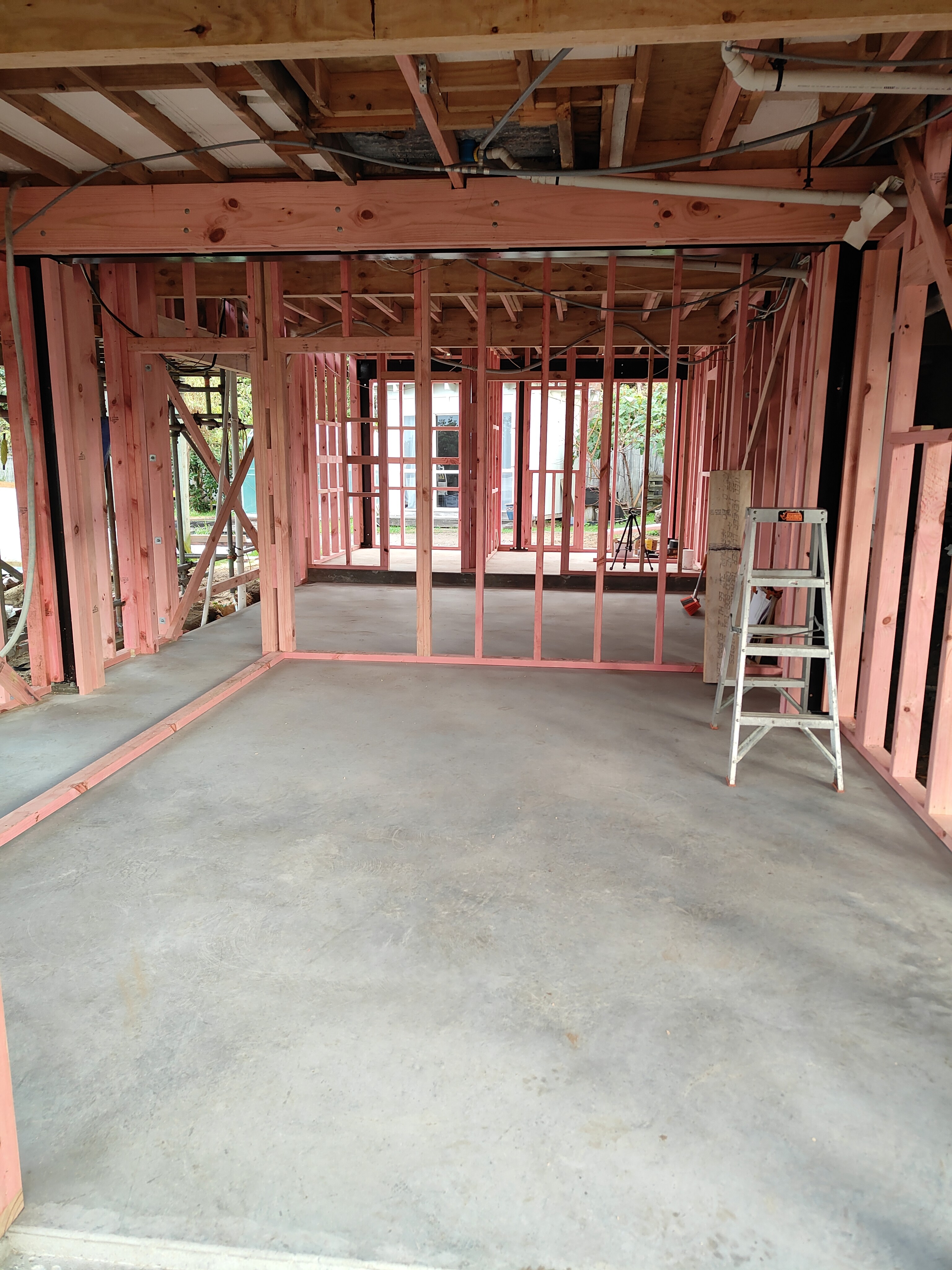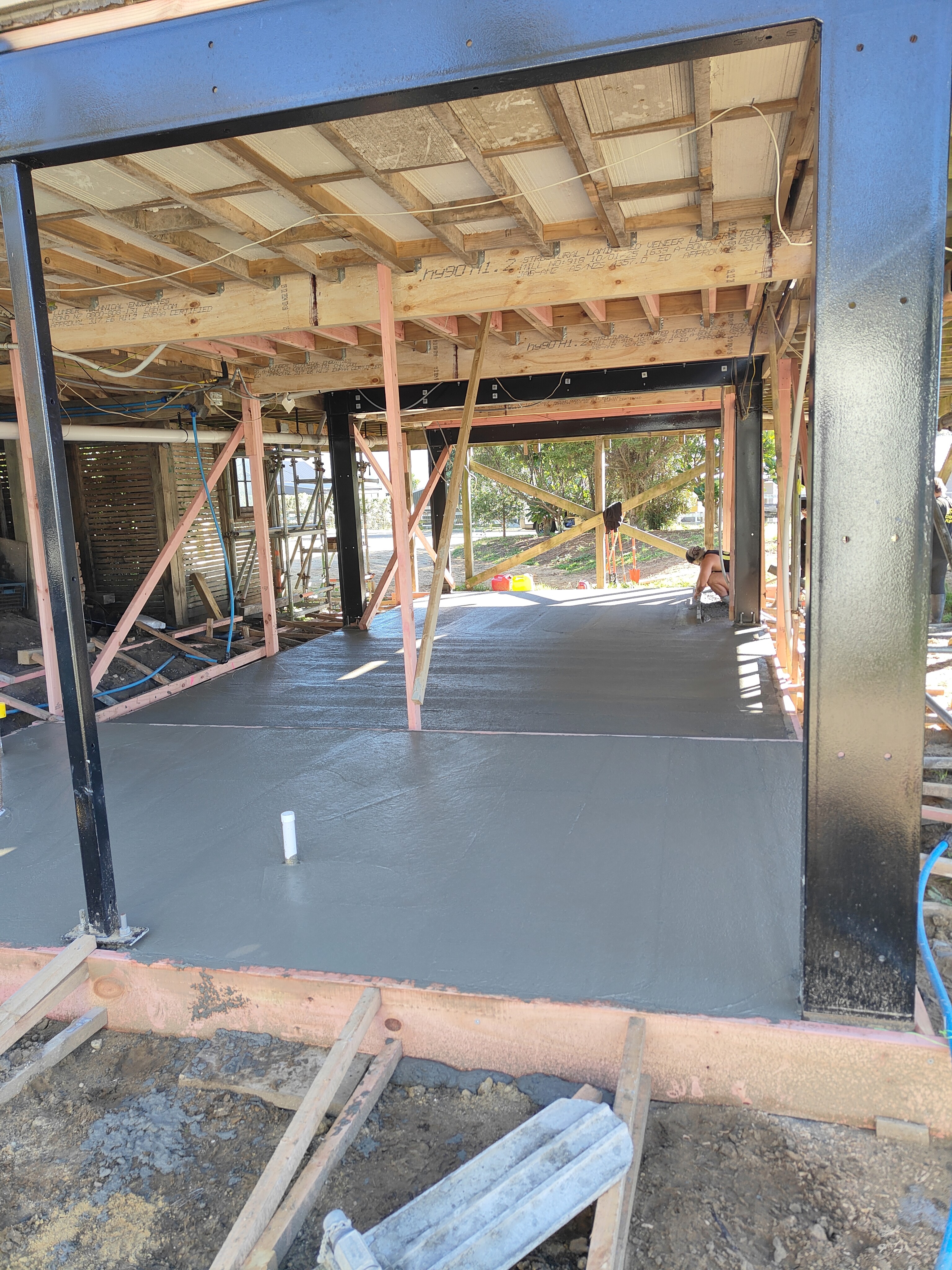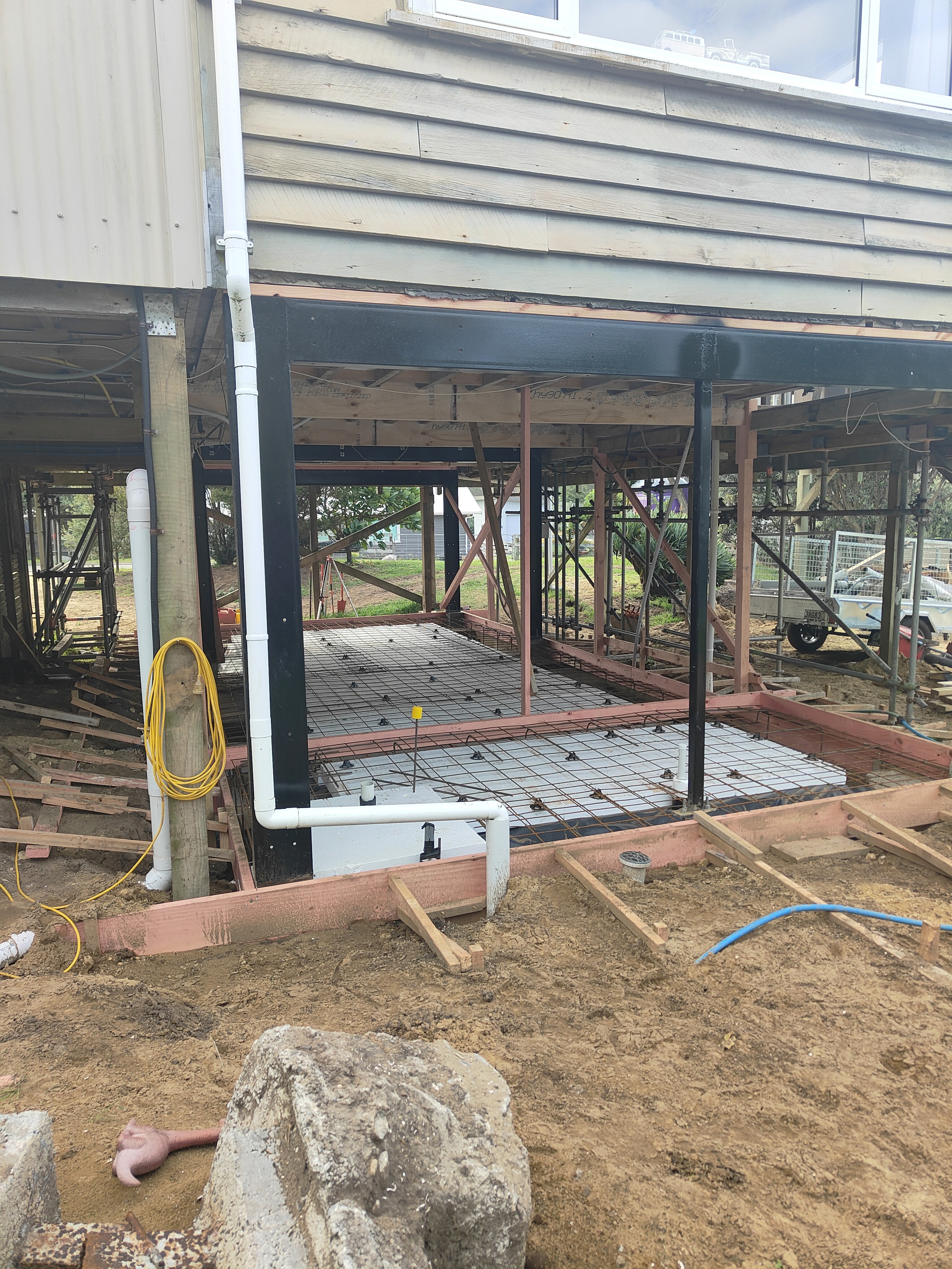 Having propped the house up, installing 3 large steel portals, then excavating the sand underneath, backfilling with compacted hardfill and laying the foundations.